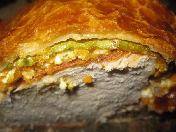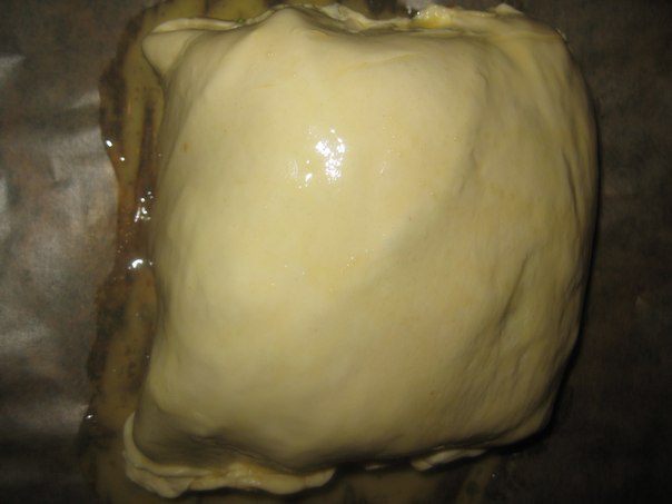 Завернуть мясо с начинкой в тесто, смазать желтком. Выложить на противень, швом вниз. Противень смазать жиром или растительным маслом. Выпекать 40 минут.