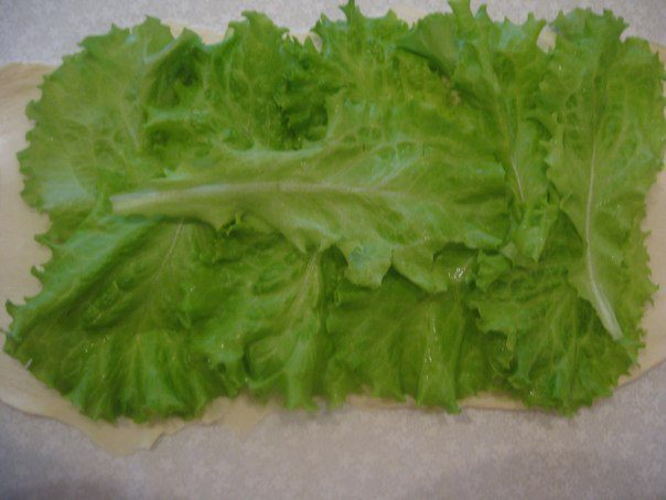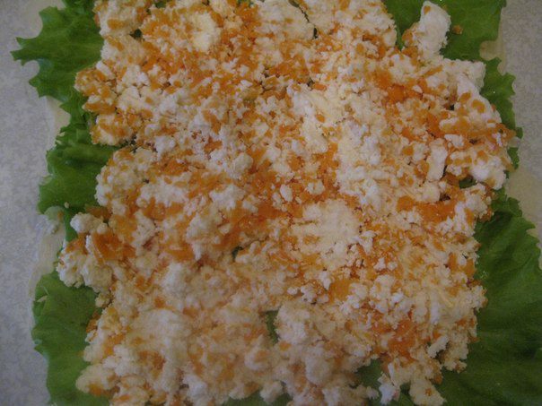 На листья салата выложить творожный сыр перемешанный с тертой морковью.