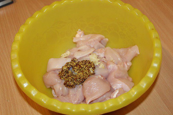 Куриное филе нарезаем на небольшие кусочки. Добавляем горчицу, натертый чеснок. Солим и перчим по вкусу.