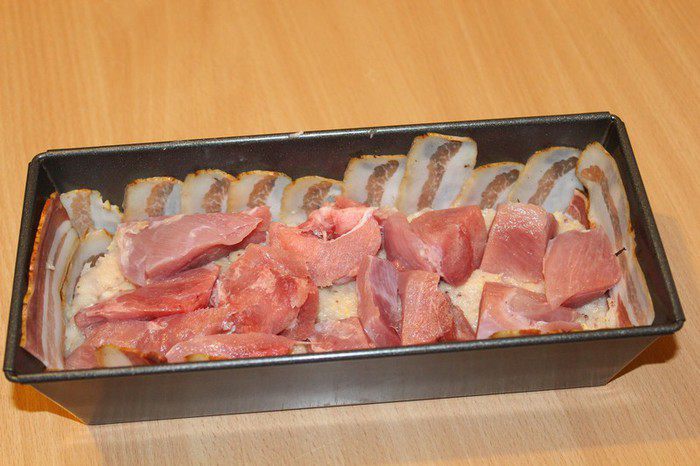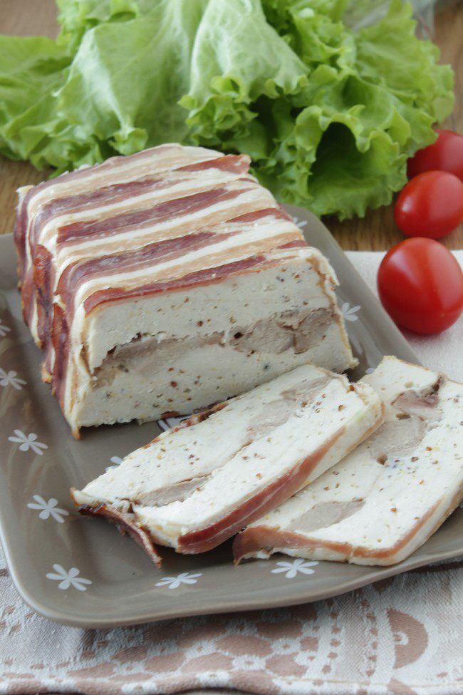 Ставим в форму большего размера и наливаем в нее кипятка так, чтобы он доходил до верхней трети формы с террином. Отправляем в предварительно разогретую до 180 градусов духовку и запекаем 1 час. Затем охладить.