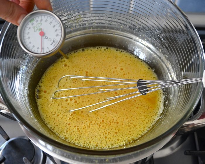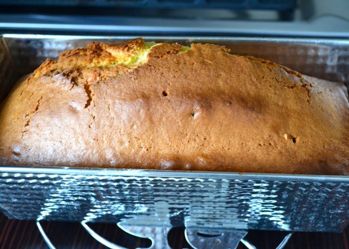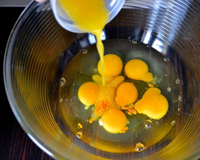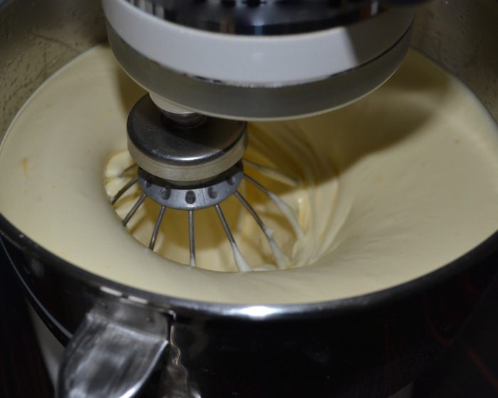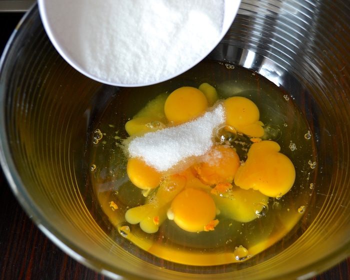 Тем временем просеять 300 грамм (от 410 граммов) муки. Снизить немного скорость миксера и, не переставая взбивать яичную массу, начать добавлять частями муку. Затем добавить в 4 приема растительное масло (у меня арахисовое), каждый раз позволяя маслу полностью перемешаться с тестом. Просеять оставшиеся 110 г муки и разрыхлитель, и в конце тоже добавить в тесто.