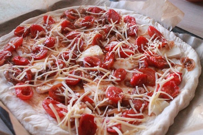Возьмите большой противень или круглую большую форму. Выложите пекарской бумагой и растяните тесто руками придав круглую форму лепешке. Сверху выложите сыр и залейте соусом.