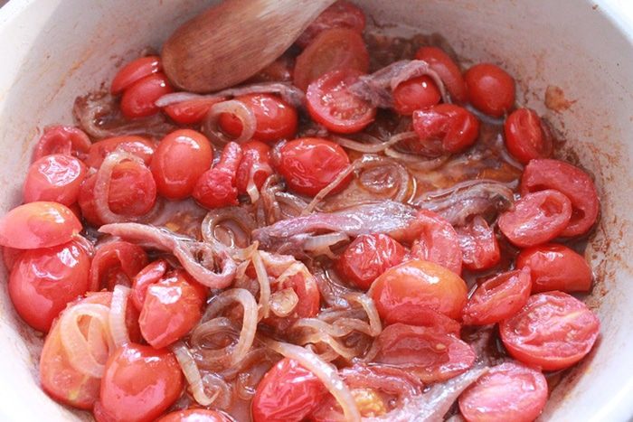 Для соуса разогрейте в сковороде 2 столовые ложки масла и обжарьте нарезанный кружочками лук. Добавьте помидоры и закройте крышкой, тушите 15 минут. Затем добавьте анчоусы и уберите с плиты.