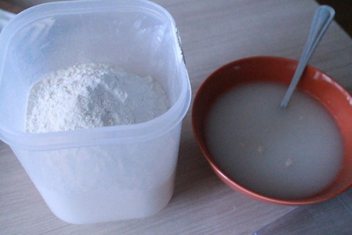 В теплой воде смешать дрожжи, соль, муку. Хорошо вымесить тесто, накрыть влажным полотенцем и поставить в тепло.