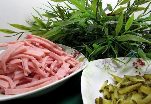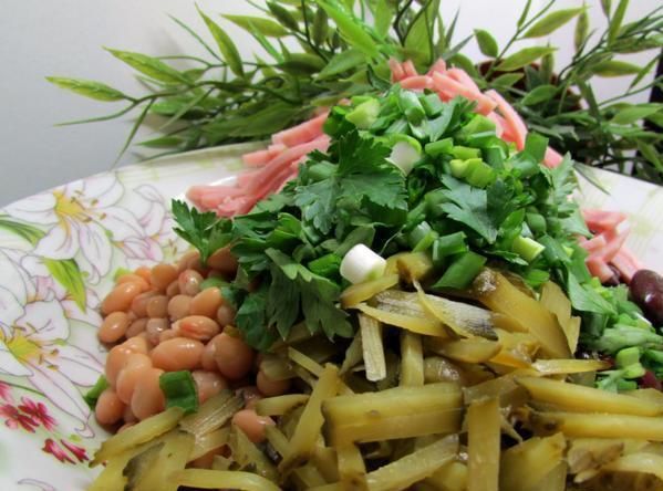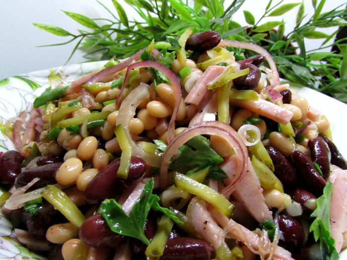 Прекрасное сочетание белой и красной фасоли с ветчиной, маринованными огурцами и острым луком! Что может быть лучше на праздничном столе?