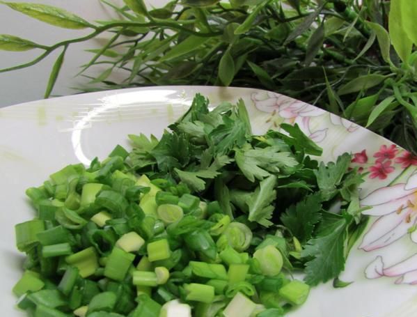 Зелень вымыть, обсушить. Зелёный лук нарезать колечками, с петрушки снять листики. Петрушку можно заменить на кинзу (на любителя).