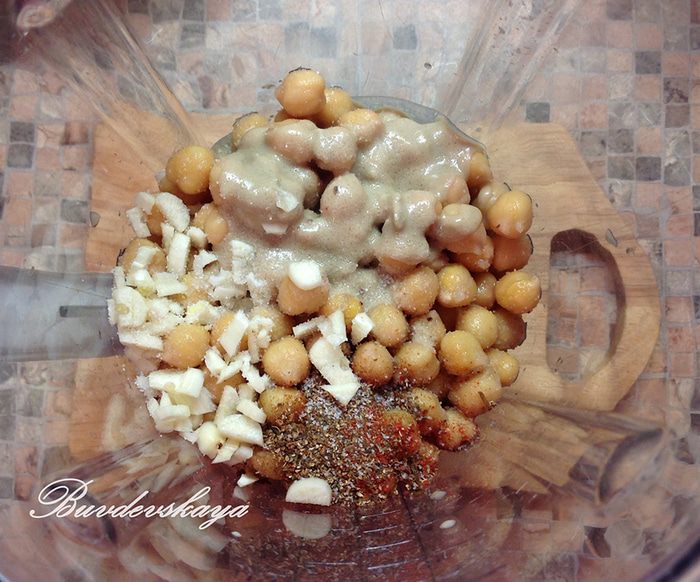 Переложить нут в чашу блендера, добавить все остальные ингредиенты, кроме оливкового масла. Пюрировать до однородного состояния. Если пюре слишком густое, добавить пару столовых ложек холодной воды. Не выключая блендера, влить тонкой струйкой оливковое масло. В зависимости от количества масла хумус получится более или менее кремовой текстуры.