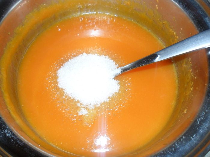 Всыпать лимонное желе и сахар, перемешать до полного растворения желатина.