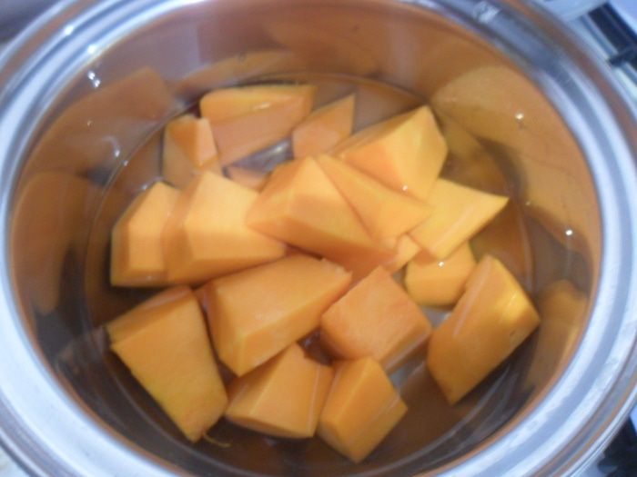 Тыкву очистить, нарезать. Должно быть 200 гр уже очищенной тыквы. Залить водой и поставить на огонь, варить 10-12 минут до мягкости.