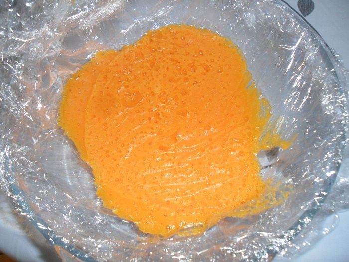 В форму уложить пищевую пленку, смазать маслом и вылить массу. Отправить в холодильник до застывания.