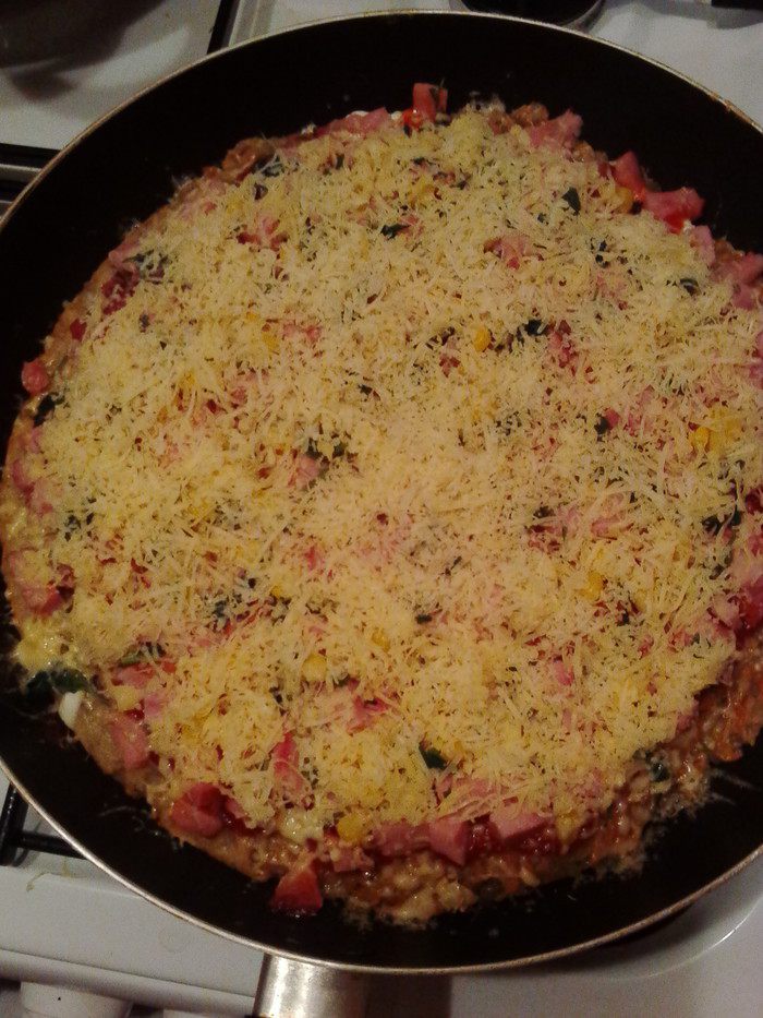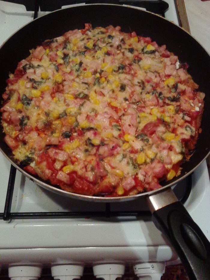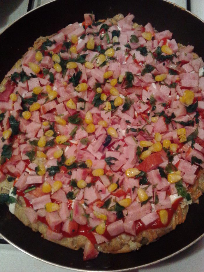 Поверх добавляем подготовленную ветчину (или любую другую колбаску). Гурманы могут добавить пару ложек замороженной или консервированной кукурузы.