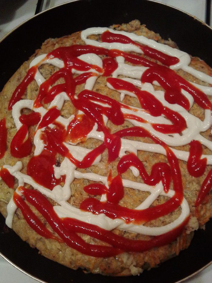 Тем временем режим кубиком ветчину и пропускаем через пресс чеснок. Перевернуть образовавшийся корж, смазать чесноком его верх (уже зажаренный). Сверху (по желанию) можно смазать майонезом или сметаной, выложить нарезанные помидоры или смазать кетчупом.