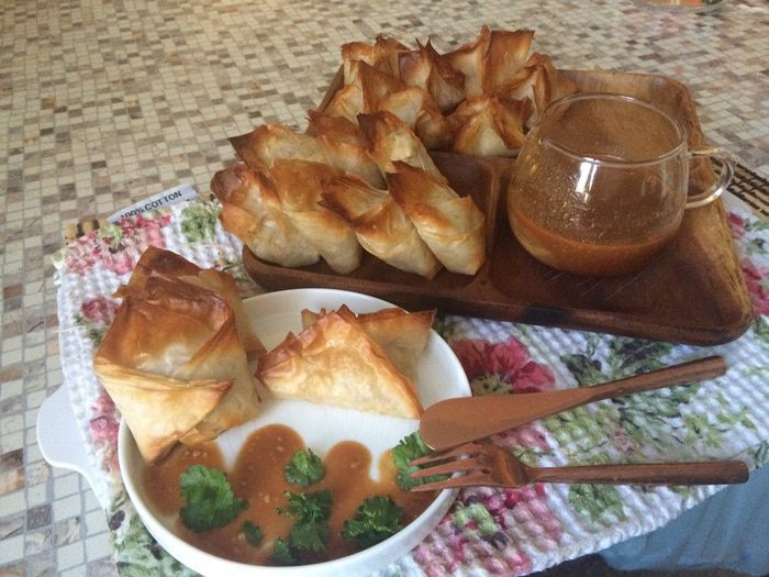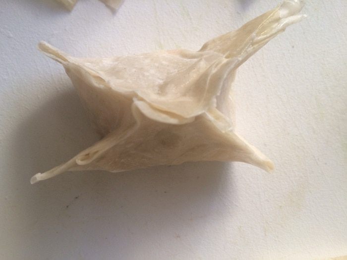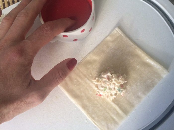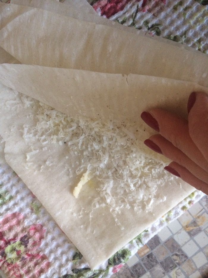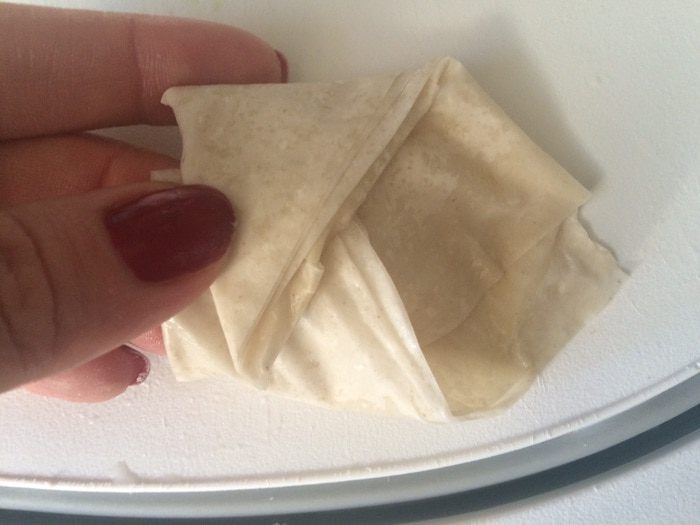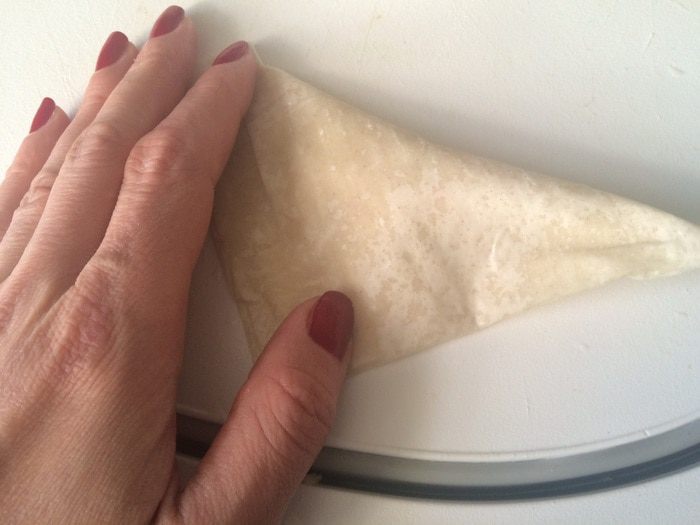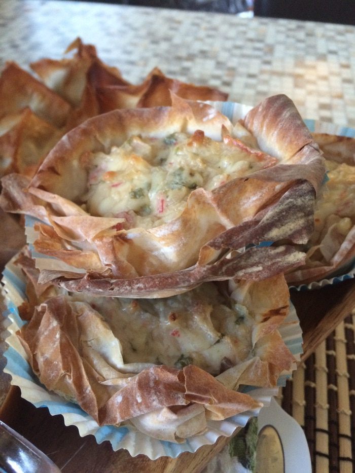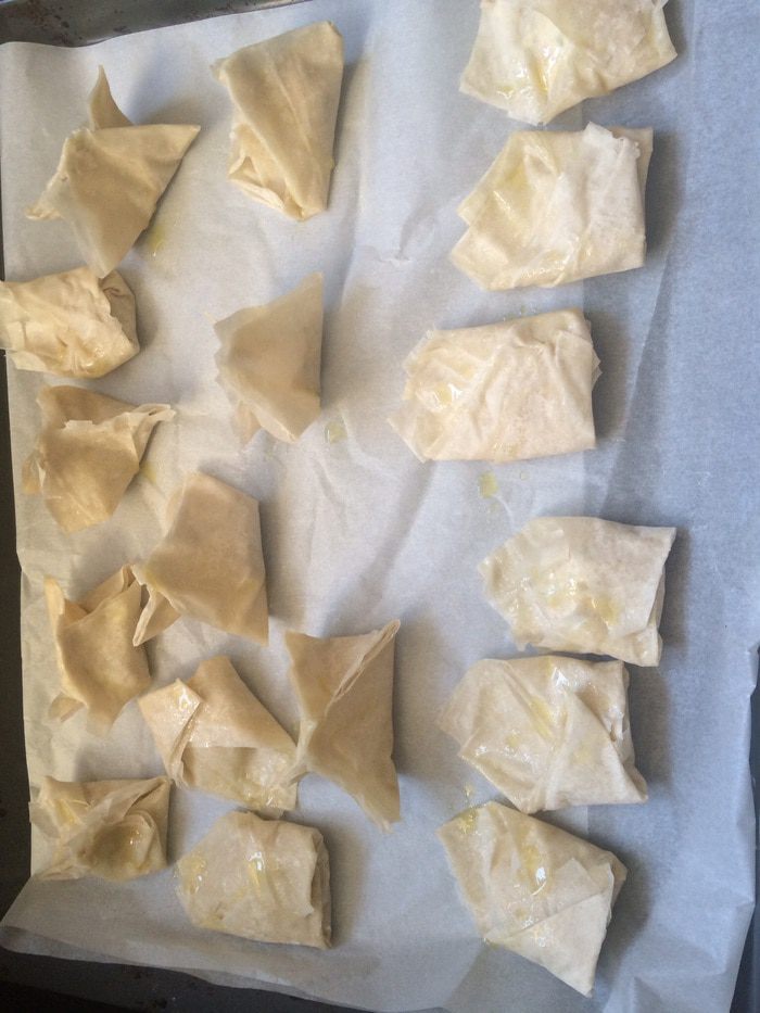 Во избежание пересушивания листов фило, работайте с парой листов за раз, остальные накрывайте влажным полотенцем. Такая же схема с тестом для вонтонов. С вантонами вообще просто. Завернули ложку начинки скрепили и на противень. С фило чуть сложнее. Все зависит от размера листов, у разных производителей они соответственно отличаются. Ну суть простая: сделать двухслойный лист и разрезать его на 4 квадрата со стороной приблизительно 10-12 см. Слои можно между собой смазать кисточкой, смоченной оливковым маслом, растопленным сливочным или просто водой.