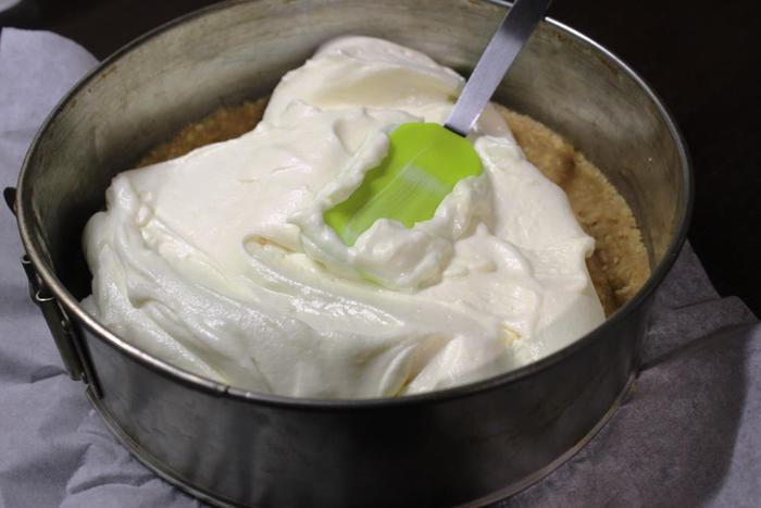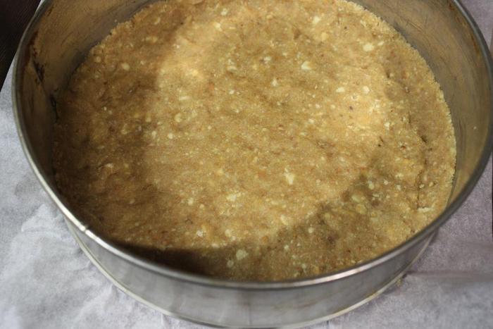 Выкладываем получившееся "тесто" в разъемную форму, дно которой застелено пергаментом, и утрамбовываем. Бортики формируем по желанию.