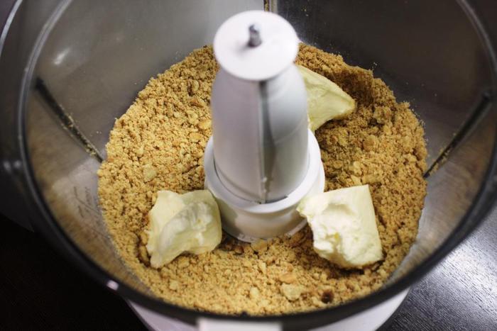 Делаем основу. Измельчаем печенье с размягченным маслом до однородной массы.