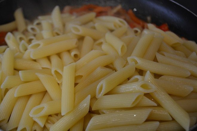 Пасту отвариваем в подсоленной воде до состояния «аль-денте». И добавляем к рыбе и овощам. Перемешать и снять с огня.