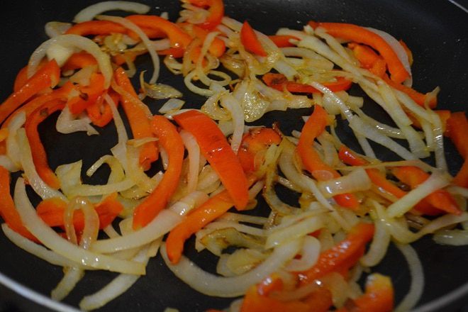 На раскаленной сковороде с оливковым маслом обжарить лук и болгарский перец в течение 7 минут. Добавить рубленый чеснок и жарить еще в течение 1 минуты.