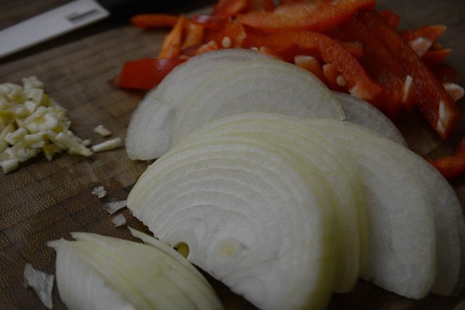 Подготовим овощи: лук очистить и порезать полукольцами. Перец болгарский помыть, удалить семена и нарезать соломкой. Чеснок измельчить.