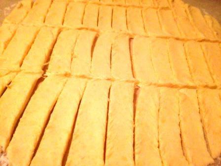 Разделить тесто пополам и 1 часть раскатать на припыленном мукой листе пергамента. Разрезать на полоски шириной примерно 1 см и длиной 5-7 см.