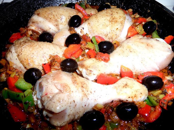 Вслед добавить маслины (я вылила ещё рассол от них) и накрыть крышкой. Тушить на среднем огне минут 35, в процессе переворачивая ножки. Вместо рассола берём бульон или воду.