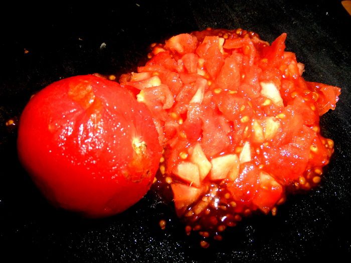 Томаты очистить от кожицы, ошпарив кипятком и измельчить. Можно использовать консервированные!