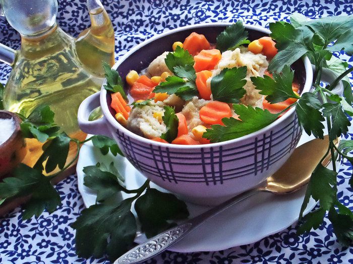Только я добавила от себя кукурузу и укроп в клёцки. Если делать маленьким детям, то лучше клёцки поменьше кидать, они разбухают. У меня вышли "на два укуса", но у меня и детки взрослые :)