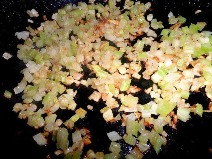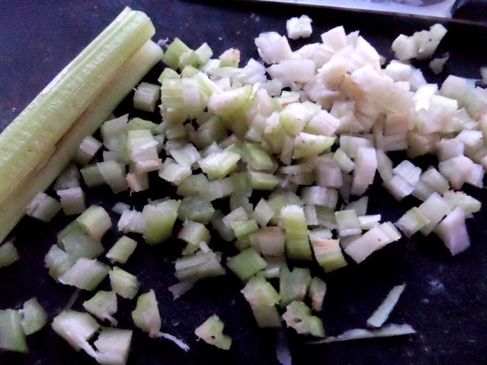 Пока ножки обжариваются, сельдерей, лук и чеснок нарежем на мелкие кубики.