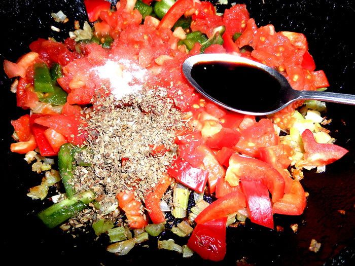 Отправить томаты к луку с сельдереем и чесноком. Добавить перечисленные приправы и перемешать.