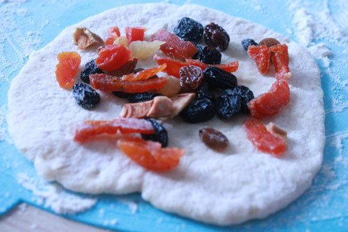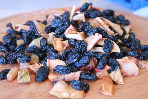 Пока наше тесто поднималось, мы помыли сухофрукты (у меня изюм, курага, яблоки), обсушили и мелко порезали.