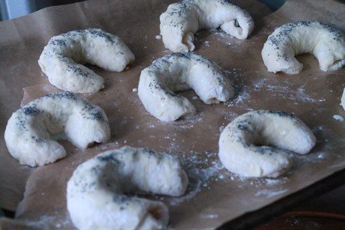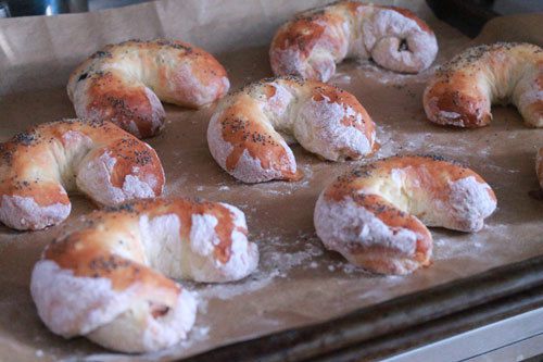 Свернуть рулетом и придать форму полумесяца.