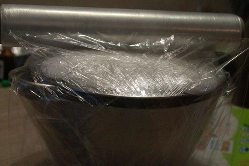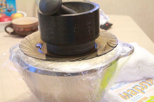 Берём большую и высокую чашку. На неё вешаем дуршлаг, таким образом, чтобы между дном чашки и дуршлаком было большое расстояние( сыворотка не должна касаться творога). Сверху укладываем 5-6 слоёв марли.