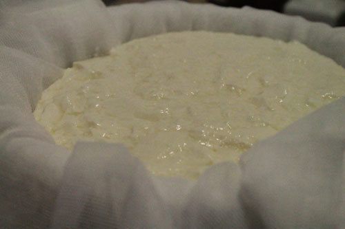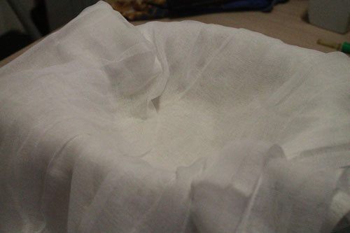 Выливаем створоженное молоко на марлю и накрываем его сверху свободными концами марли.