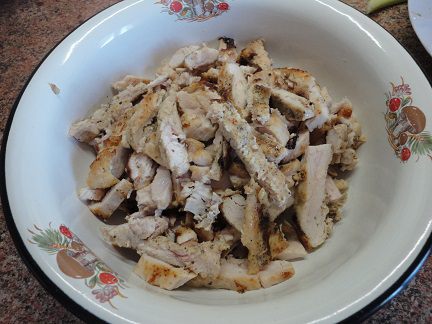 Филе слегка отбить, посолить, поперчить (можно смазать горчицей) и обжарить до золотистой корочки. Нарезать соломкой.