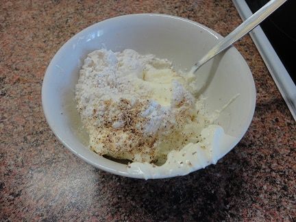 Муку соединить со сметаной, добавить мускатный орех и перемешать.