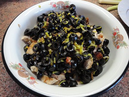 Лук и маслины мелко нарезать и обжарить на растительном масле. Соединить с куриным филе.