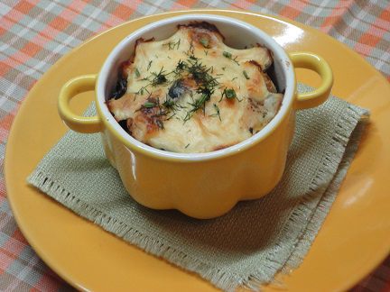 Формочки смазать сливочным маслом, наполнить начинкой и залить сметаной. Запекать в духовке 10-15 минут при температуре 200 - 220 градусов.