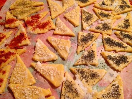 Смазать треугольники взбитым белком и присыпать маком, кунжутом, орегано, сладкой паприкой, розмарином, а можно и просто солью на ваше усмотрение.