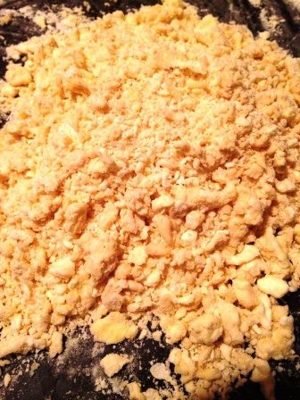 Затем разделить шар пополам и каждую часть раскатать на пергаментном листе в квадрат 20х20 см, разрезать на 16 квадратов и каждый перерезать по диагонали, чтобы получились треугольники.