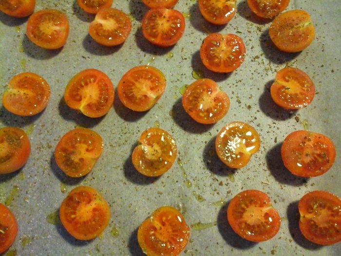Через час после как вы поставили индейку, займемся гарниром. Помыть помидоры, разрезать пополам, посолить, посыпать орегано, полить маслом. Выпекать 1 ч при 145*.