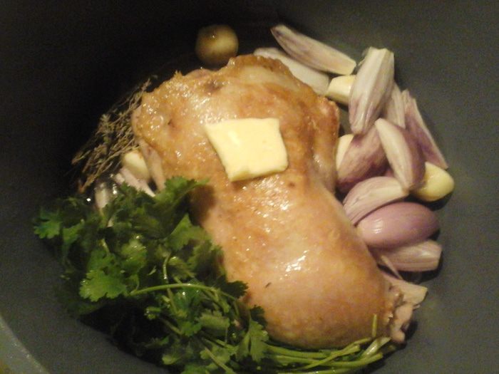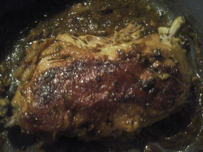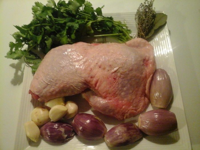 Ножка индейки конфи-шалот с печеными помидорами черри