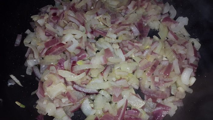Обжариваем на оливковом масле мелко нарезанный чеснок и два вида лука.