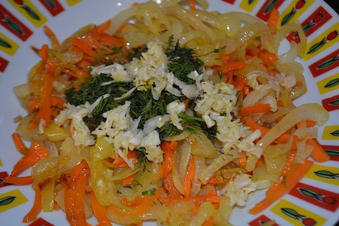 Лук порезать полукольцами, морковь и болгарский перец - соломкой. Обжарить на растительном масле до мягкости. Добавить зелень укропа и чеснок через пресс. Перемешать.