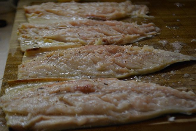 Скумбрию разрезать по животу и хребту. Аккуратно удалить хребет и внутренности, промыть филе и обсушить бумажным полотенцем. Посолить, поперчить и полить соком лимона.