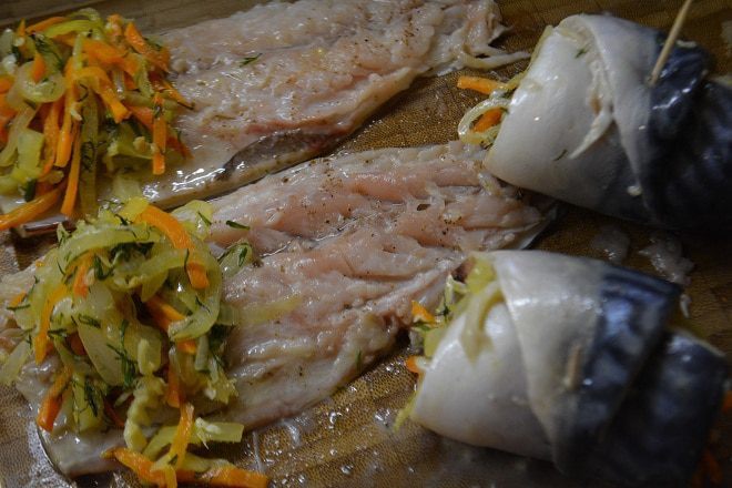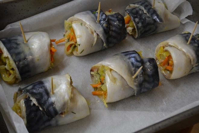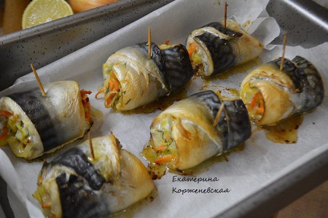Обычно я скумбрию запекаю целиком, в брюшко кладу укроп. В этот раз решила отойти от привычного рецепта и приготовила вот такие рулетики.Результат превзошел все ожидания! Овощи безупречно сочетаются с этой рыбкой. Сочно,смачно и очень вкусно!
