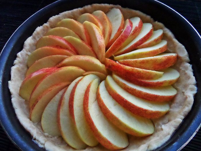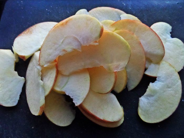 Раскладываем веером на тесто. Сверху я посыпала сахаром (1 ст.л.) с корицей.