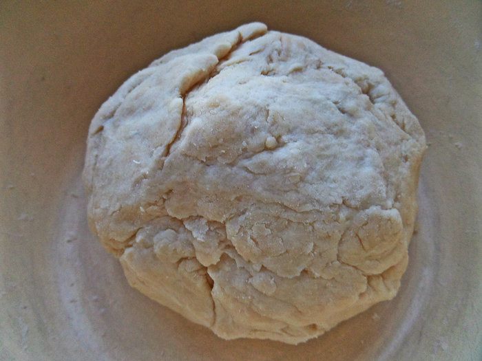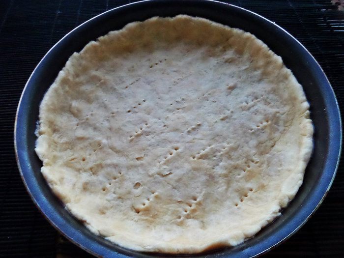 Разминаем тесто по форме с бортиками (22 см), дно накалываем вилкой.