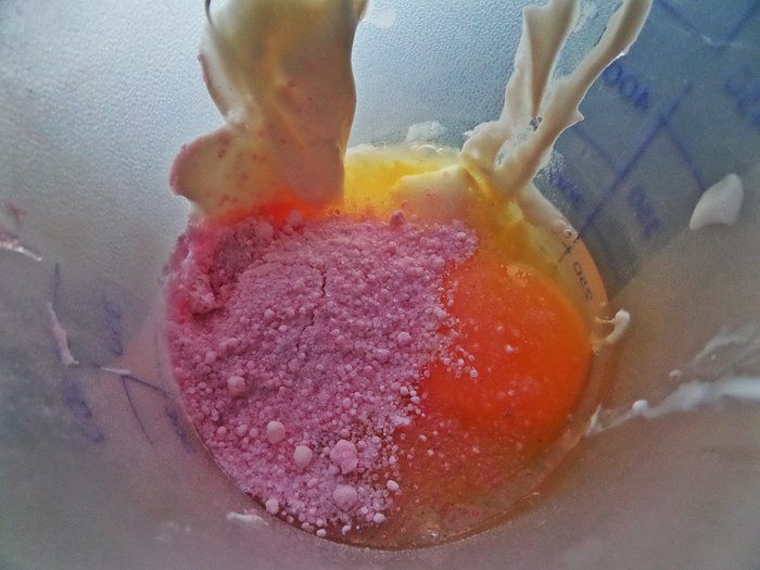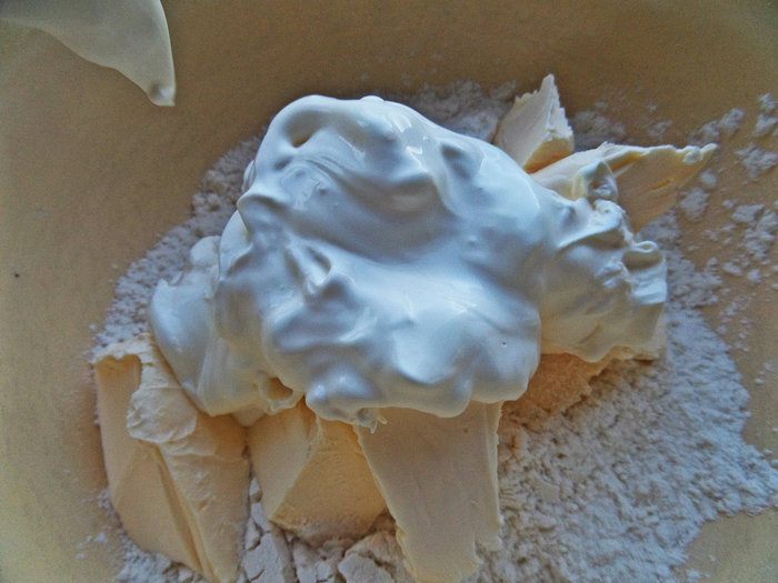 Затем подсыпаем муку с разрыхлителем и смотрим, сколько тесто возьмёт муки, может быть и больше, до 200 г. Замешиваем мягкое приятное тесто.