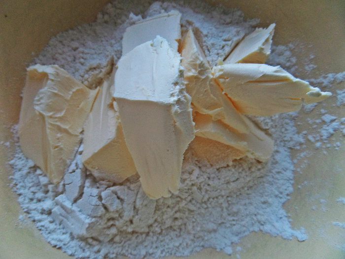 В просеянную муку (не всю муку), добавим масло комнатной температуры.