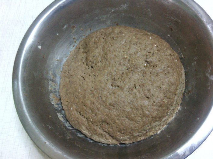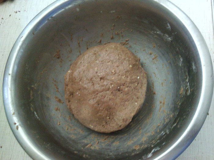 Влить квас, какао с медом и кофе, растительное масло - замесить тесто. Выложить тесто на присыпанную мукой поверхность и вымесить его не менее 10 мин. Положить тесто в миску, смазанную маслом, накрыть полотенцем и оставить на 2-2,5 ч. в теплое место. За это время тесто подойдет, и его объем увеличится вдвое.