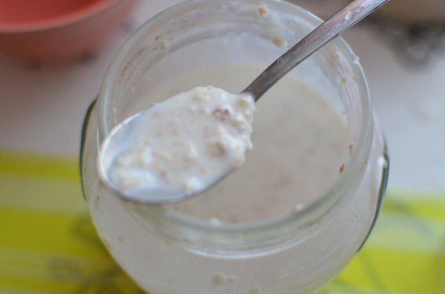 Берем чистую банку с закручивающейся крышкой. Насыпаем туда овсяные хлопья (не быстрого приготовления), натуральный йогурт, молоко, сахар (можно использовать любой подсластитель: сахар, сгущенное молоко, джем и т.д.). Закрываем банку плотно крышкой, как следует встряхиваем и ставим в холодильник, оставляем до утра. К утру хлопья пропитаются и основа для завтрака готова.